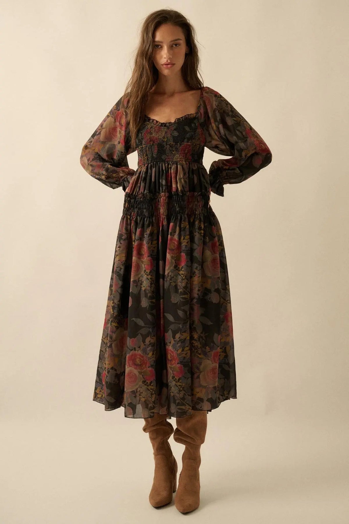 Myrtle Smocked Dress The Myrtle Smocked Dress offers a playful blend of charm and comfort with its floral-print and wrinkle-texture fabric. Featuring a sweet ruffle-edged sweetheart neckline, smocked bodice, and puff sleeves with ruffle cuffs, this fit-and-flare midi dress creates a flattering silhouette. The high waist and smocked skirt with lettuce-edge details add whimsical flair, while its open back and sleeveless lining keep things breezy. Perfect for sunny days and special moments, this dress combines effortless style with a touch of fun in 100% polyester.