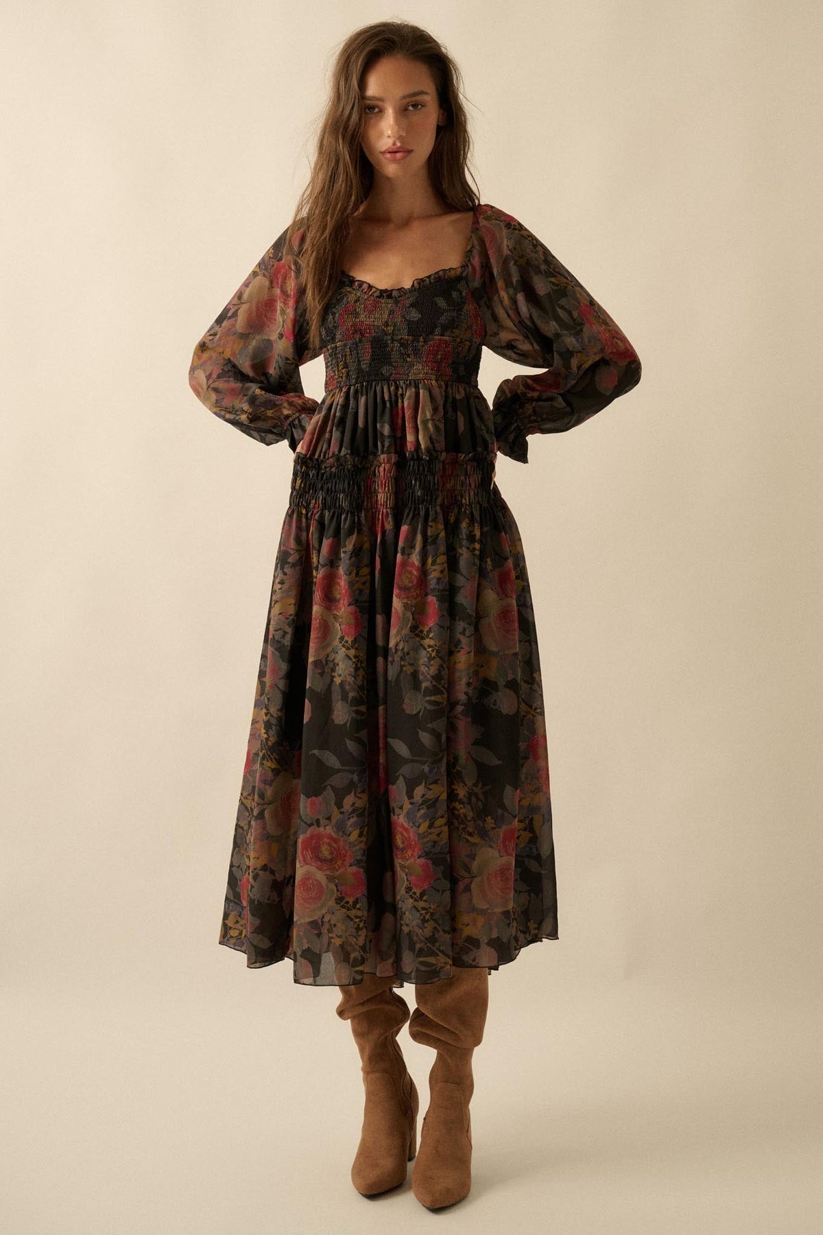 The Myrtle Smocked Dress offers a playful blend of charm and comfort with its floral-print and wrinkle-texture fabric. Featuring a sweet ruffle-edged sweetheart neckline, smocked bodice, and puff sleeves with ruffle cuffs, this fit-and-flare midi dress creates a flattering silhouette. The high waist and smocked skirt with lettuce-edge details add whimsical flair, while its open back and sleeveless lining keep things breezy. Perfect for sunny days and special moments, this dress combines effortless style with a touch of fun in 100% polyester.