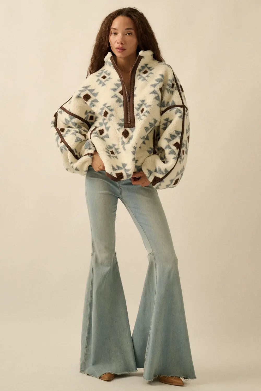 Grand Canyon Sherpa Jacket Wrap yourself in cozy vibes with the Grand Canyon Sherpa Jacket—a geometric-print pullover that's equal parts comfort and cool. The high collar and half-zip front let you dial in your warmth, while roomy side pockets keep your essentials close. Drop shoulders and a relaxed fit create that effortlessly laid-back silhouette, and contrast trim adds a playful pop throughout. Long sleeves with elastic cuffs seal in the coziness, making this unlined sherpa your new go-to for casual adventures and chilled-out days. Fit: Runs true to size, relaxed fit, model is wearing a size small.