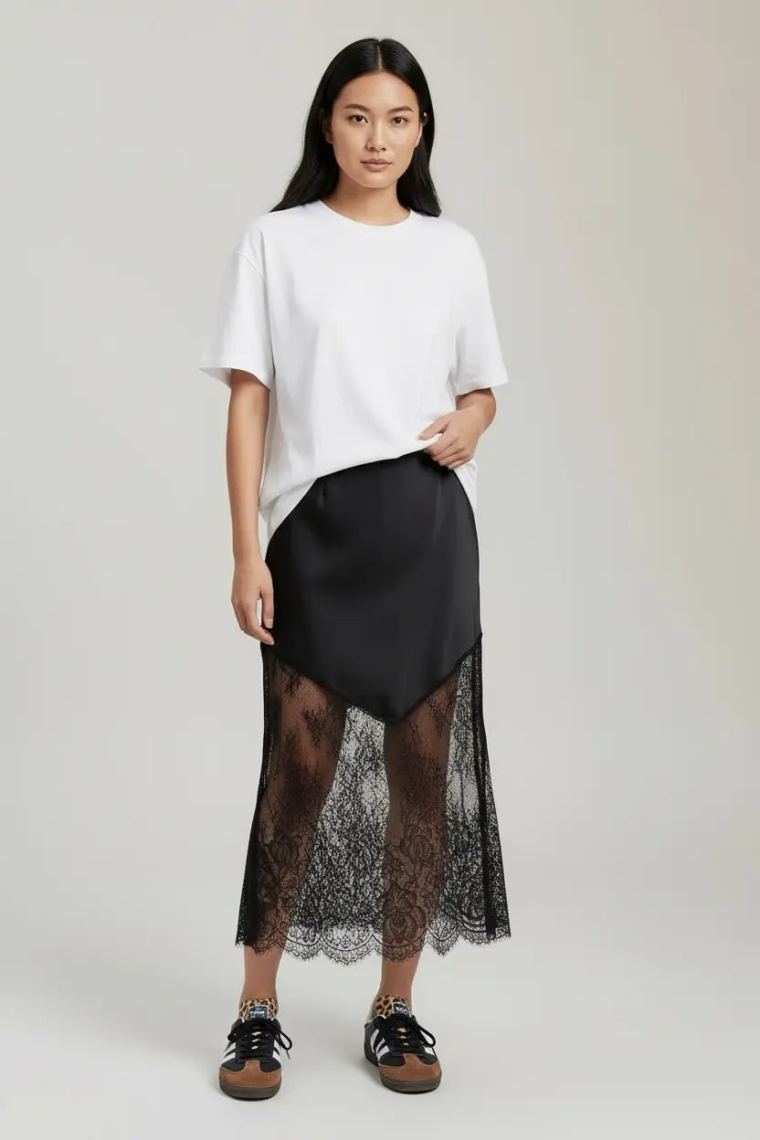 Meet the skirt that makes your everyday outfit look like you tried (even if you absolutely did not). The Bondi Lace Skirt is a sleek, feminine piece with a dreamy V-front satin detail and a delicate lace hem that adds just the right amount of flirt. This women’s lace skirt is the definition of “easy elevated”—pair it with a chunky sweater and boots for cozy-cute vibes, or style it with a fitted tee and a denim jacket for effortless weekend polish. Heading to dinner? Add a silky cami and heels and let the lace do the talking. Made from lightweight 100% polyester, this skirt drapes beautifully and moves with you (no stiff, scratchy, “why did I buy this” energy). It runs true to size, so you can order confidently and get back to the important things—like deciding which top deserves to be seen with it.