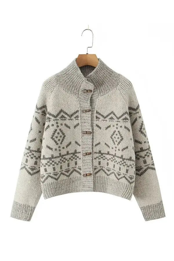 Elevate your layering game with this refined jacquard cardigan, featuring an exquisite high neckline and wood button front closure. Crafted from sumptuous knitted fabric, this piece seamlessly transitions from casual to polished occasions. The intricate jacquard pattern adds visual depth and texture, while the structured silhouette flatters effortlessly. Perfect for those who appreciate timeless elegance with a contemporary edge.