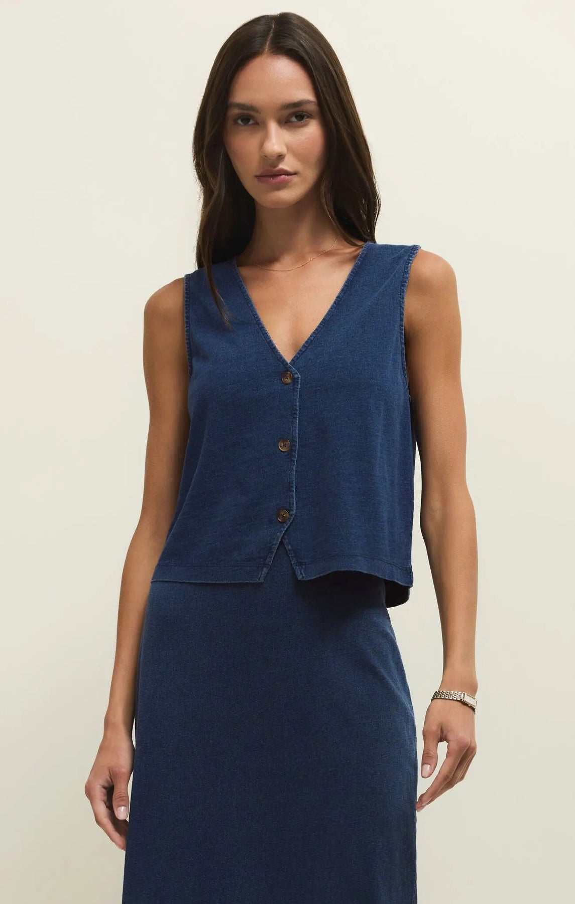 Noelle Jersey Denim Top is your soft-meets-structured answer to effortless everyday style. Made from lightweight 21s cotton knit jersey, this jersey denim top gives you the look of denim with the comfort of your favorite tee. The mineral wash adds that perfectly lived-in feel, while the flattering V-neckline and button-front detail bring just enough polish to elevate your outfit. Sleeveless and breathable, it’s ideal for layering under a lightweight jacket or wearing solo on warm days. For a head-to-toe moment, style it as a set with the Gail Jersey Denim Midi Skirt in Indigo for an easy, coordinated look that feels modern, comfortable, and completely put together. Add sneakers for daytime errands or slide into a strappy sandal to dress it up—either way, this denim-inspired matching set makes getting dressed simple (and chic).