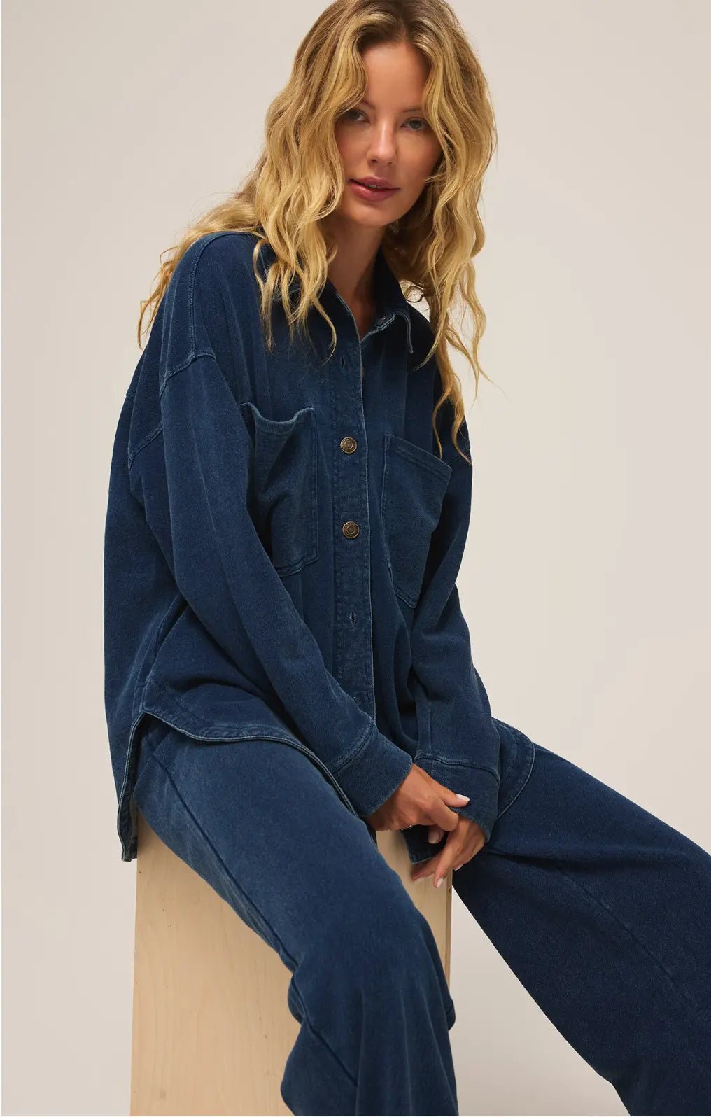 All Day Knit Denim Jacket - Indigo This jacket, which is part of our best selling All Day collection, gets its irresistibly soft feel from our signature knit fabric. This outerwear layer has that much-loved, worn-in vintage look you love, and will look good season after season. Product Details: Collared Long sleeve Button front Patch pocket Midweight Regular fit Knit Denim French Terry: 85% Cotton, 15% Polyester ZJ231161 Make it a set with the Hunter Knit Denim Pant in Indigo  Shop the All Day Knit Denim Jacket in Indigo at Beloved Boutique in Breckenridge, Colorado