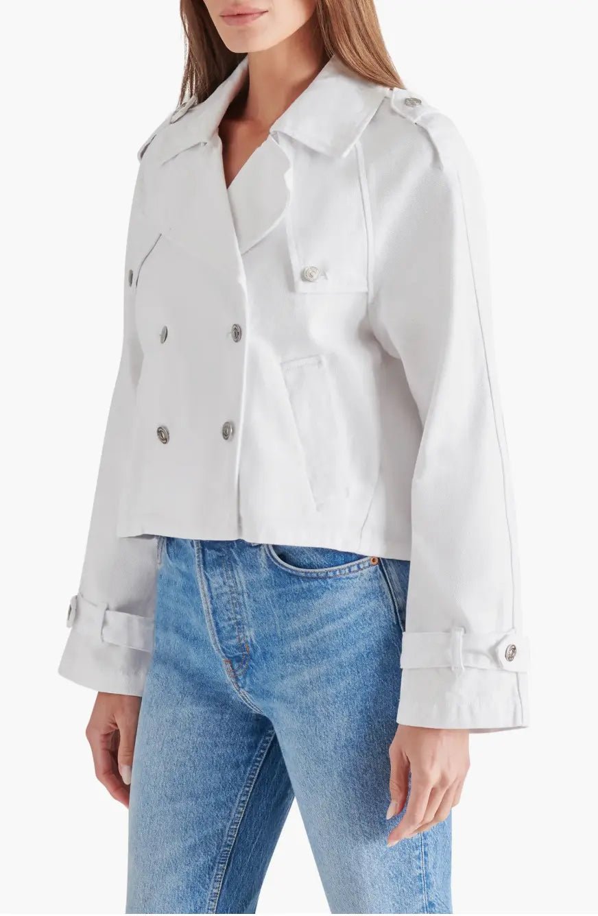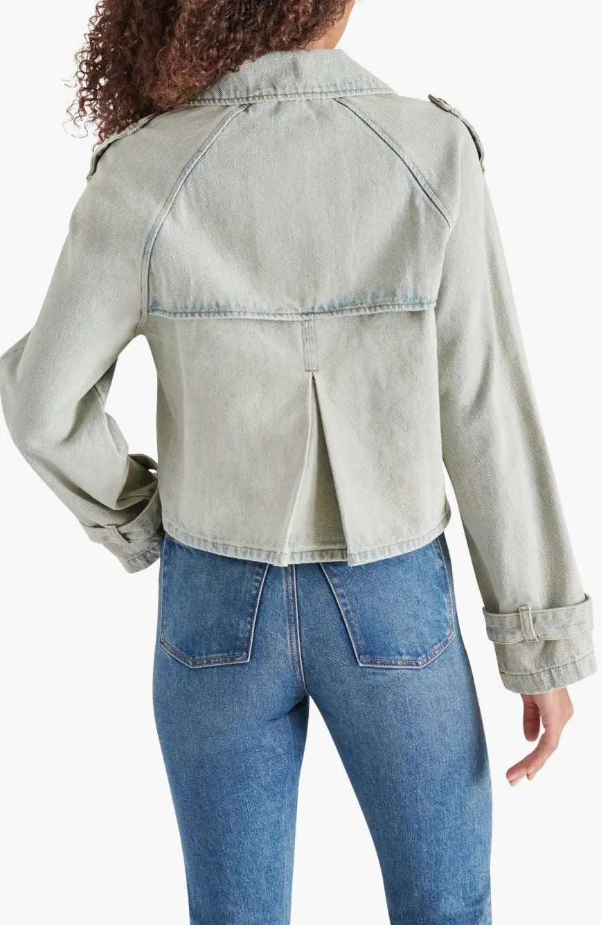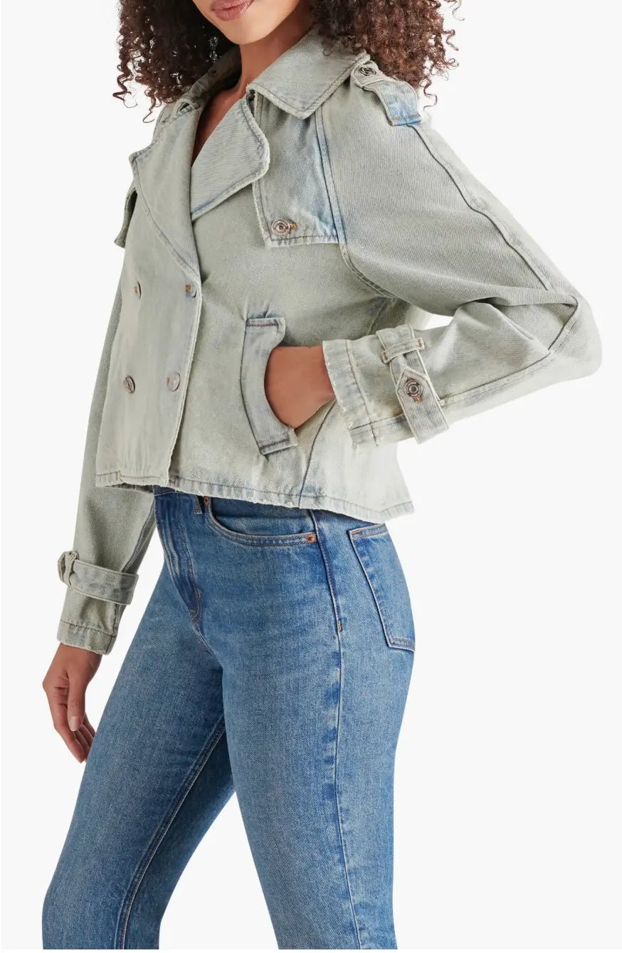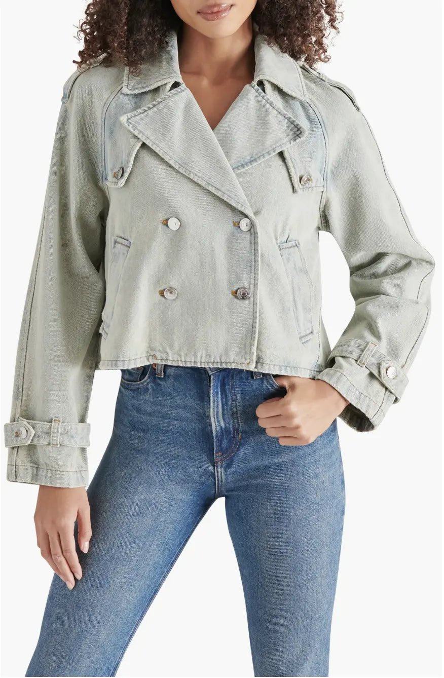 This cropped take on the classic trench is cut from nonstretch denim in a boxy, double-breasted cut with all the classic details. 20" length (size Medium) Double-breasted button closure Notched lapels Belted cuffs Front welt pockets Button gun flaps 100% cotton Machine wash, tumble dry