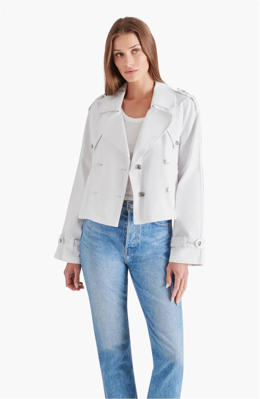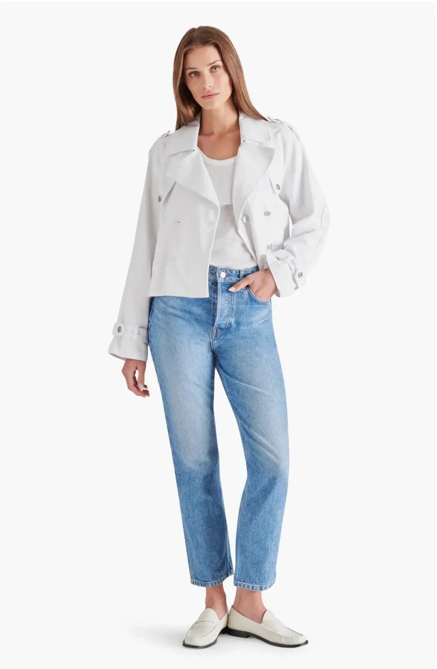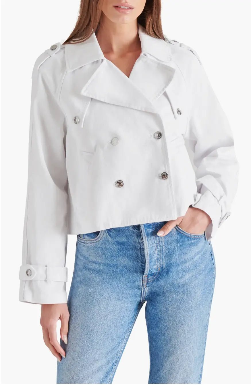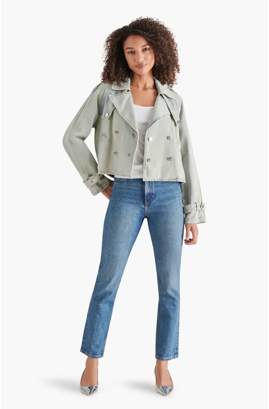 This cropped take on the classic trench is cut from nonstretch denim in a boxy, double-breasted cut with all the classic details. 20" length (size Medium) Double-breasted button closure Notched lapels Belted cuffs Front welt pockets Button gun flaps 100% cotton Machine wash, tumble dry