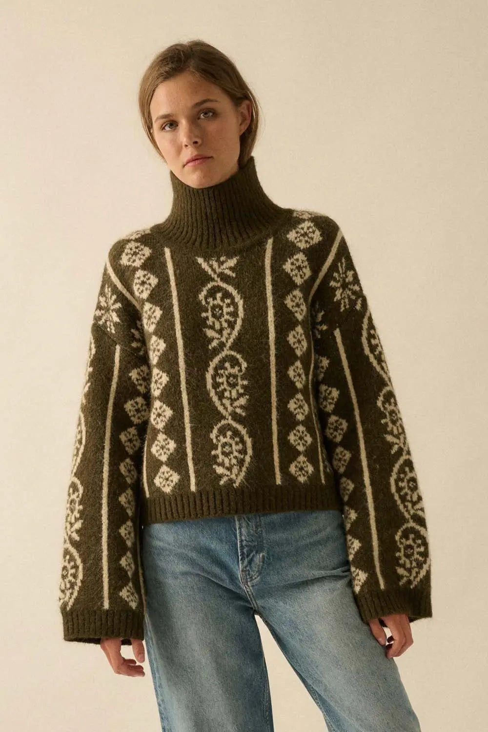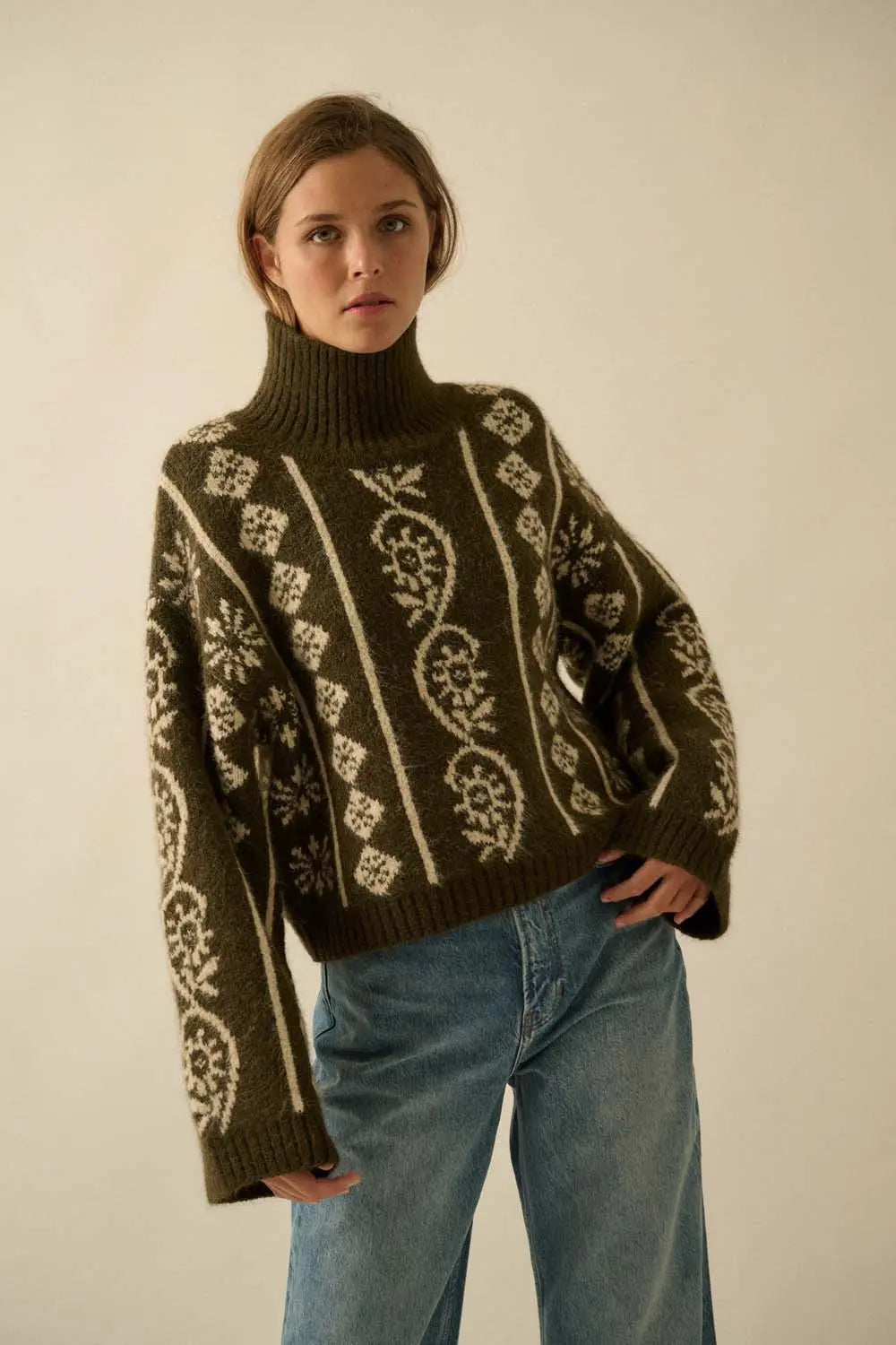 Steamboat Sweater Wrap yourself in cozy charm with the Steamboat Sweater, a fuzzy jacquard-knit dream featuring whimsical abstract florals and snowflakes dancing across the fabric. The high mock neckline keeps you snug while wide, drop-shoulder sleeves offer effortless style and movement. Ribbed details at the collar, cuffs, and hem provide a polished finish, while the relaxed fit ensures all-day comfort. Perfect for layering or wearing solo, this playful knit brings warmth and personality to your winter wardrobe.