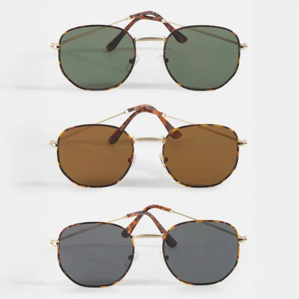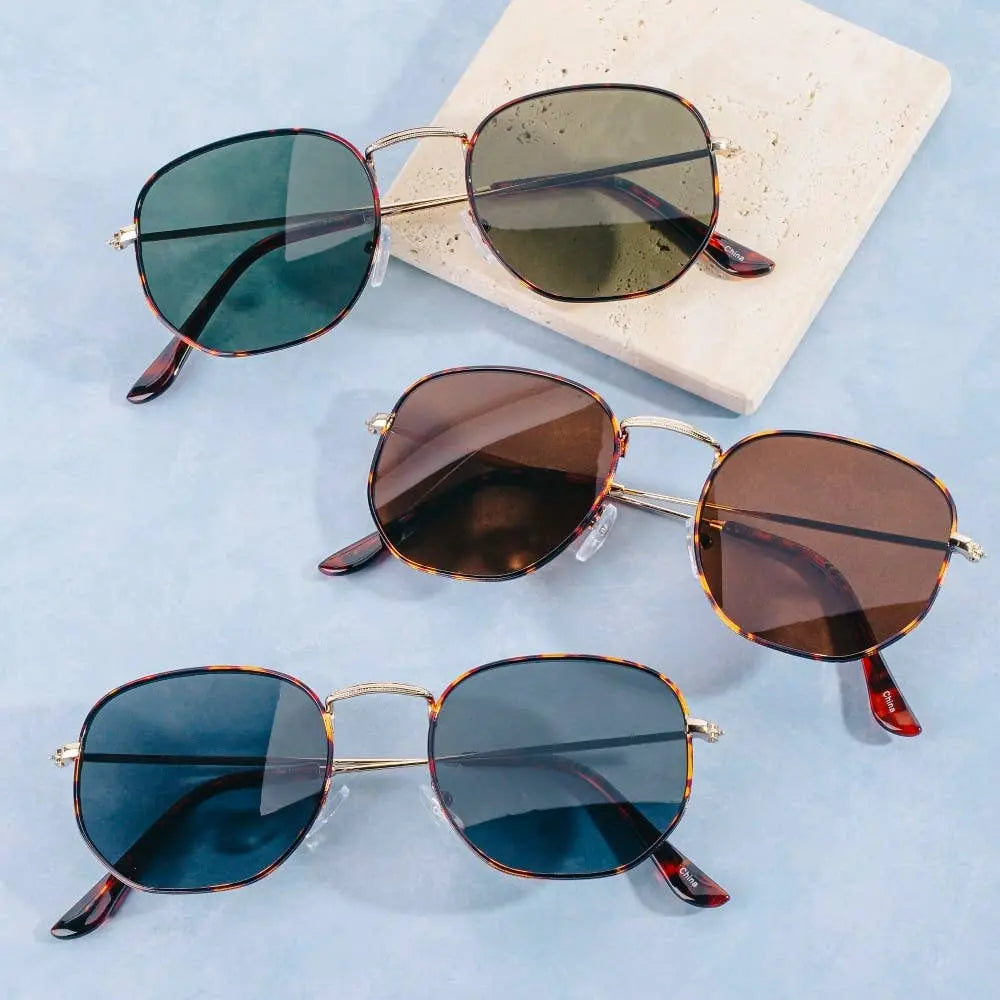 Elevate your style with something unique and daring, this set of sunglasses displays a unique thin tortoise shell frame sunglasses set design. This set of sunglasses is the perfect finishing touch to any outfit, adding a touch of sophistication and glamour. This set of sunglasses is made with 100% Metal. Made in China.