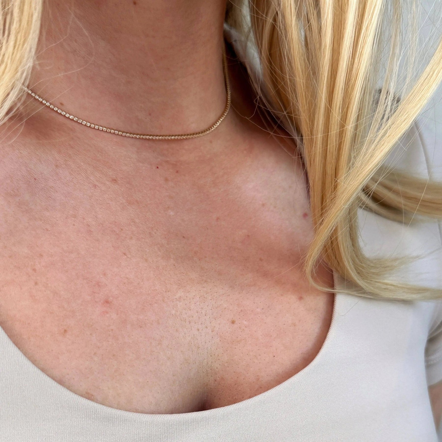 Adorn your neck with this stunning 18k gold-filled Tennis necklace. Delicate and minimalist, its classic look is sure to make a statement. Its 1.2mm cubic zirconia shine brightly, making this the perfect accessory for any outfit. * Metal: 18k Gold Filled * 1.2mm micro CZ chain * Necklace Measures 12 inches long + 4 inches extender chain * Hypoallergenic * Handcrafted in Brazil
