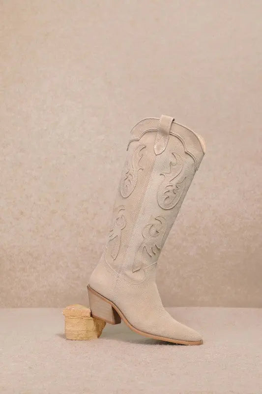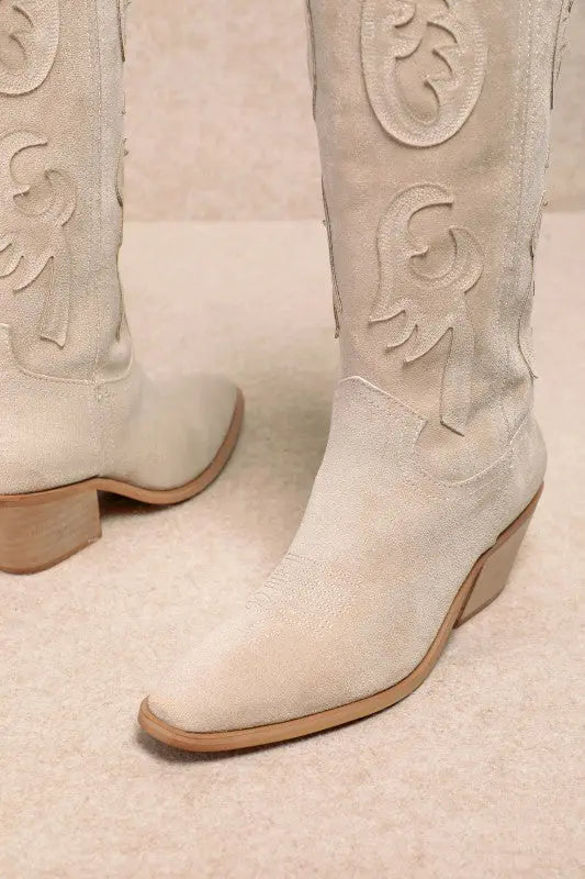 The Audrey Western Boot is a beautiful blend of classic western style and soft, feminine elegance. Crafted from supple beige suede, this boot features detailed raised stitching that adds texture and visual interest while keeping the look refined and timeless. The sleek pointed toe and mid-height stacked heel create a flattering silhouette that’s comfortable enough for all-day wear. Easy to dress up or down, the Audrey Boot pairs effortlessly with denim, flowy dresses, and layered fall-to-spring outfits, making it a versatile staple for anyone who loves understated western sophistication. Product Details: Western-inspired suede boot with raised stitching and pointed toe Heel: Mid-height stacked heel for everyday comfort Material: Soft beige suede Style: Timeless western with a feminine, modern edge