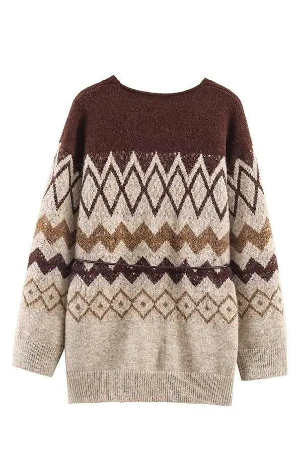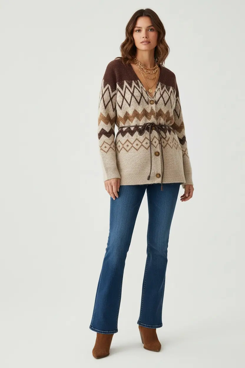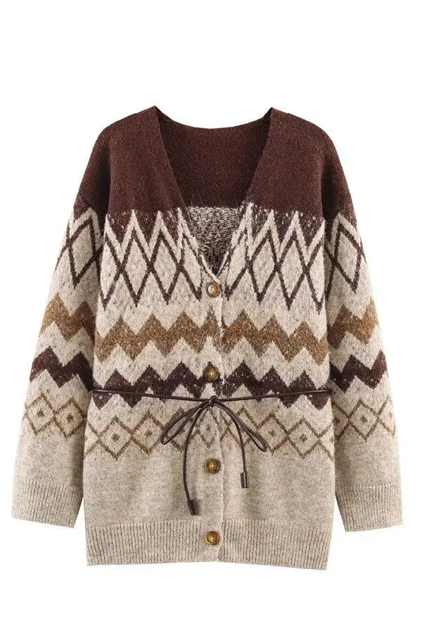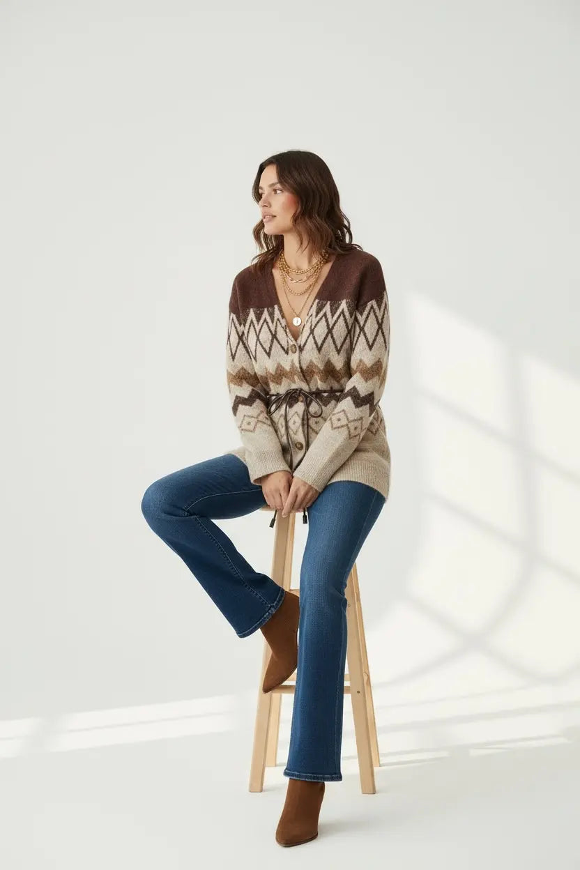 Celeste Cardigan is the cozy-chic layer your closet has been patiently waiting for. This adorable jacquard knit cardigan features a flattering v-neckline, long sleeves, and a dainty thin belt that cinches the waist just enough to give you shape without sacrificing comfort. Finished with a classic front button closure, it’s the kind of piece that instantly pulls an outfit together—no overthinking required. Pair it with your favorite denim and boots for an effortlessly cute everyday look, or layer it over a simple tee for extra warmth and texture. Cozy, flattering, and endlessly wearable… yes please. Product Details: Jacquard knit cardigan; v-neckline; front button closure; removable thin belt Fit: Runs true to size Fabrication: Soft, cozy knit with beautiful texture